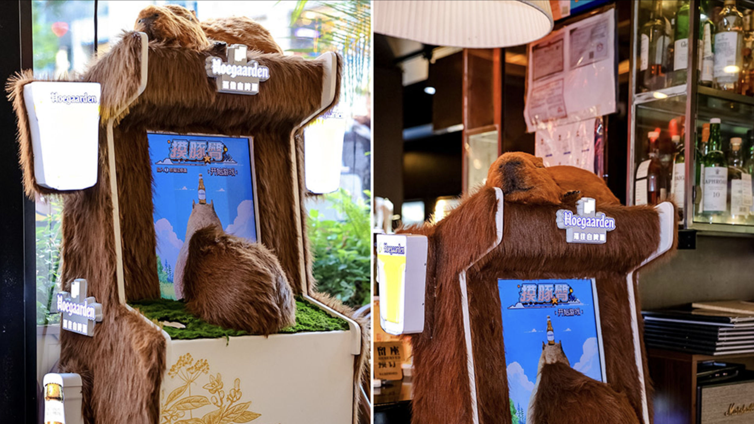 Now, installed in bars around Beijing and Shanghai, the Capybarapy game machines are powered by Hoegaarden bottle caps and are free to patrons who purchase an equally chilled Hoegaarden beer - it even has a conveniently placed beer holder.